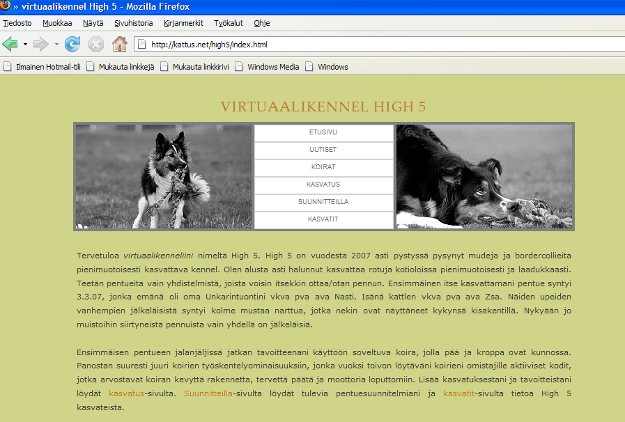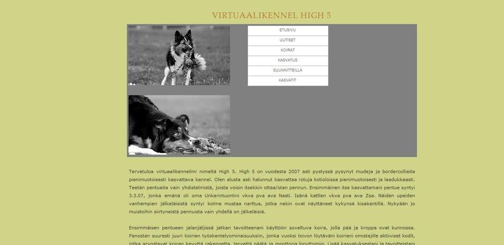 Siistin näköinen ulkoasu ja helposti selattavissa oleva sivusto. Jaksoin jopa suurinpiirtein lukea kennelisi kaikki tekstit! :o Koirien sivuilla oleva, vihreä taustaväri perustiedoille on melko erikoinen valinta muuten niin vaaleaan ulkoasuun.