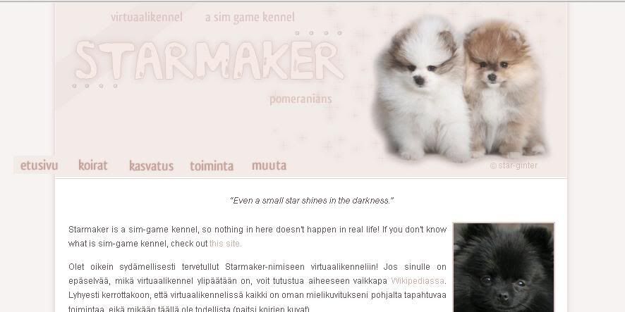 Starmaker, ihana nimi! Ulkoasussa on selvästi mietitty kolmea yhdistävää asiaa - nimeä, väriä ja kasvatusrotua! Jokaisella sivulla on ihana "viisaus", joita on tosi hauska lukea. Myös koristekuvat on hyvin aseteltu tekstikenttään - ei aina niitä samoja kolmen-neljän hengen kuvaryhmiä. Myös koirien (tai koiran) tiedot sivulla "koirat" on laitettu siististi. Tykkään myös ylipäätänsä koirien sivuista, siistit ja hyvin sommitellut. Tekstiäkin on sopivasti, jaksaa hyvin lukea. Oikein toimiva kokonaisuus, jossa on selvästi mietitty mitä on alettu tekemään!